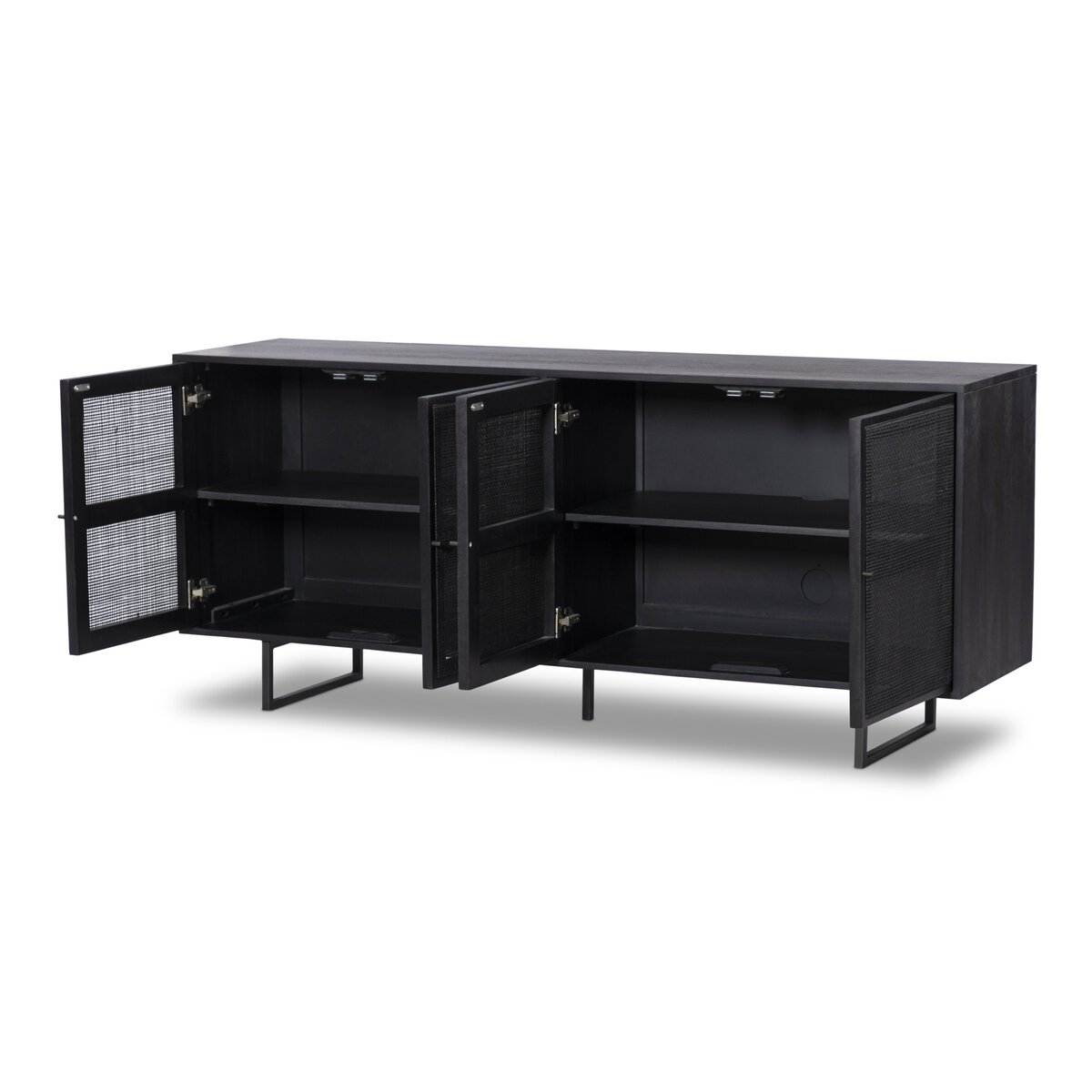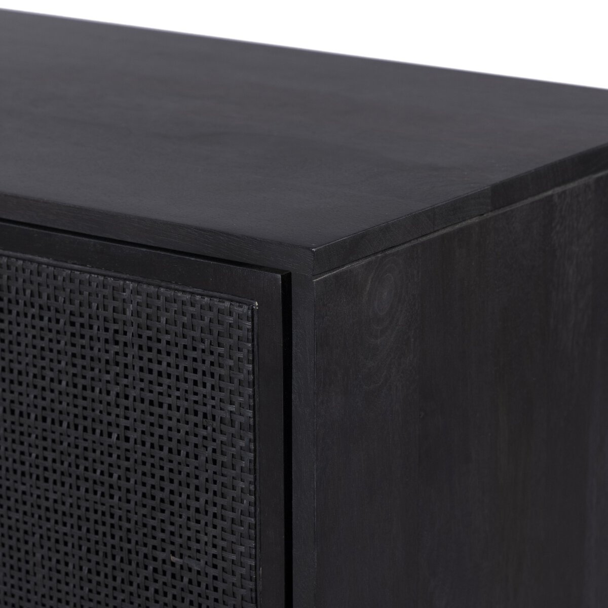 Mid-century-inspired style with an organic twist. Surrounded by black mango casing, light cane weaves for a fresh, high-contrast look with natural depth. Angular gunmetal-finished iron legs offer an intriguing contrast of texture and tone. Rich texture and organic spirit are conveyed through an eye-catching mixture of mango woods, cotton rope and natural cane. Iron accents adopt gunmetal finishes, refreshing forms’ iconic mid-century influence, as a clean-lined aesthetic is met with modern functionality.