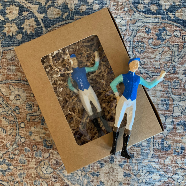 A wonderful, locally-made homage to Keeneland and Churchill Downs and the Sport of Kings! Each of these jockey ornament are hand-molded and casted using high quality resin before being hand-painted. Custom colors/silks may be available upon request. Lovingly hand-crafted by the good people at Whiskey Library Wax Works, right here in Lexington, KY! Measures approx. 6″ tall top to bottom, 3″ wide. This item was manufactured to look antique, expect some built in imperfections. Available seasonally. Extremely limited supply.