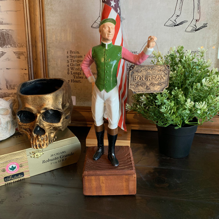 A wonderful, locally-made homage to Keeneland and Churchill Downs and the Sport of Kings! Each of these jockey statues are hand-molded and casted using high quality resin before being hand-painted and mounted to a hand-stained reclaimed wood base.  Custom colors/silks may be available upon request.  Lovingly hand-crafted by the good people at Whiskey Library Wax Works, right here in Lexington, KY! Measures approx. 11.25.” tall top to bottom, 6.5″ wide.  This item was manufactured to look antique, expect some built in imperfections.  Available seasonally during Keeneland meets.  Extremely limited supply.